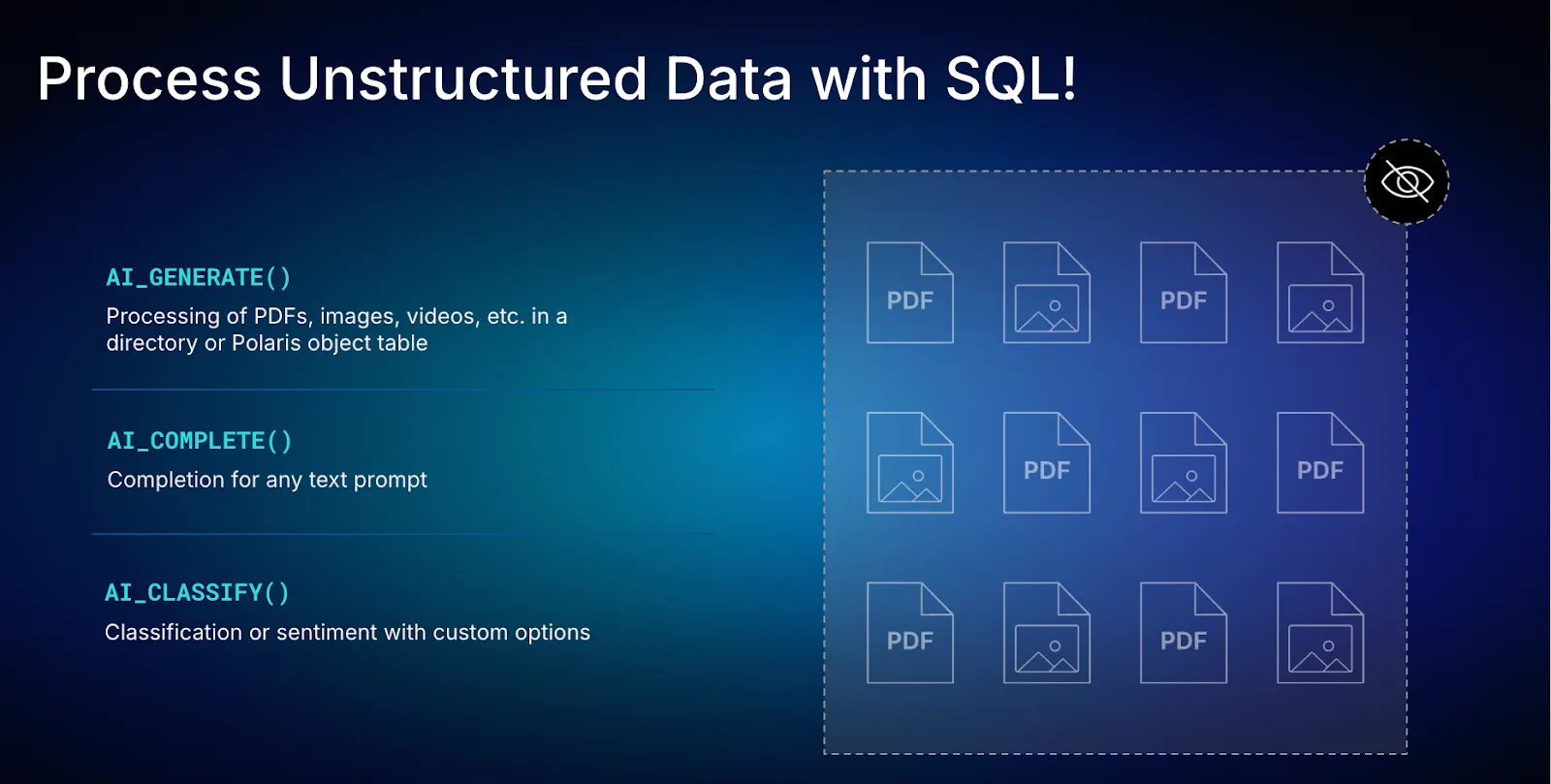 Query PDFs, images, videos, and documents directly alongside structured data—no preprocessing required. Dremio's AI Functions enable you to process unstructured data using standard SQL. Extract insights from PDFs, classify images, analyze documents, and generate summaries—all within your queries alongside structured data for comprehensive analytics.