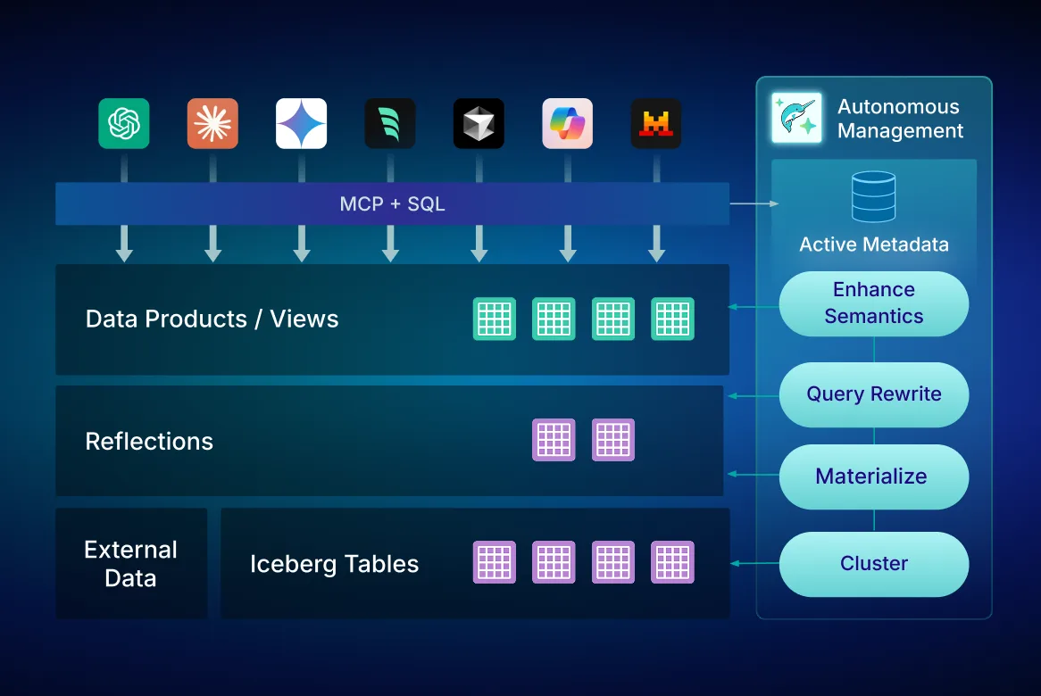 Zero manual tuning required—Dremio's active metadata continuously optimizes performance, delivering lightning-fast queries at the lowest cost. Dremio autonomously enhances semantics, analyzes query patterns to create optimized materializations (Reflections), transparently rewrites queries to use these Reflections for 20x faster performance, and intelligently reorganizes data layouts—eliminating manual partitioning.
