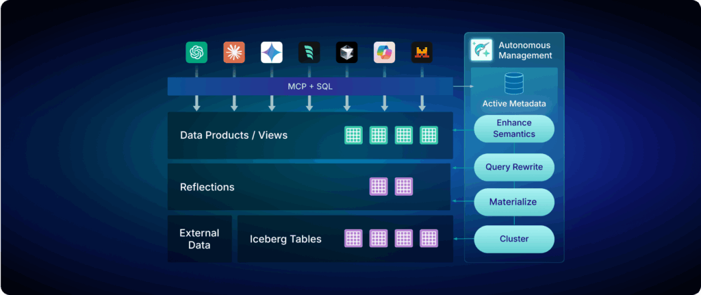 No data movement required. Dremio queries data where it lives using advanced federation. Your existing SQL queries work unchanged—they’re automatically optimized at runtime to take advantage of Reflections and intelligent caching. For Iceberg datasets, the management of Reflection based acceleration will be autonomous.