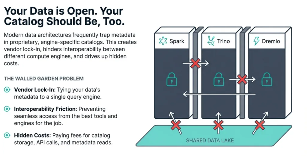 For data professionals building a modern lakehouse, the data catalog often becomes a point of contention. Proprietary catalogs can create vendor lock-in, introduce unnecessary complexity, and carry hidden costs that aren't apparent until you're deeply invested. They promise integration but often deliver a walled garden, limiting your choice of tools and inflating your bills.