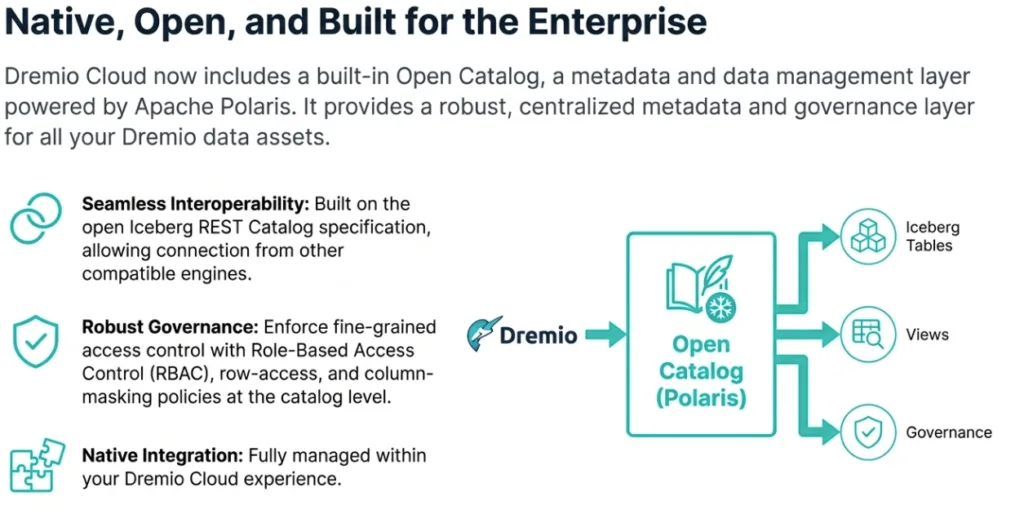 Every Dremio Cloud project includes a native Open Catalog powered by the open-source Apache Polaris project. This isn't just a branding choice; it's a commitment to open standards.