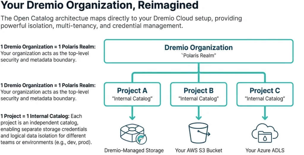 Dremio Cloud provides a simple yet powerful organizational structure that facilitates multi-tenancy and data governance. A Dremio Organization serves as the top-level container (An Apache Polaris “Realm” or Tenant), and within it, you can create multiple Projects. Each Project functions as a distinct and separate Apache Polaris internal catalog.