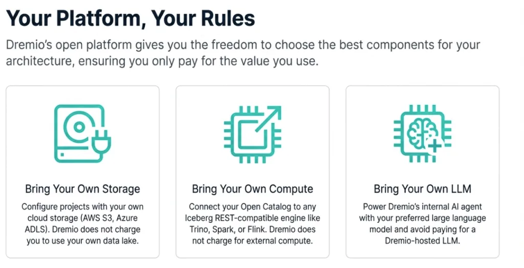 Dremio’s open-platform philosophy extends beyond the catalog, giving you the freedom to choose your own components for compute, storage, and even artificial intelligence.