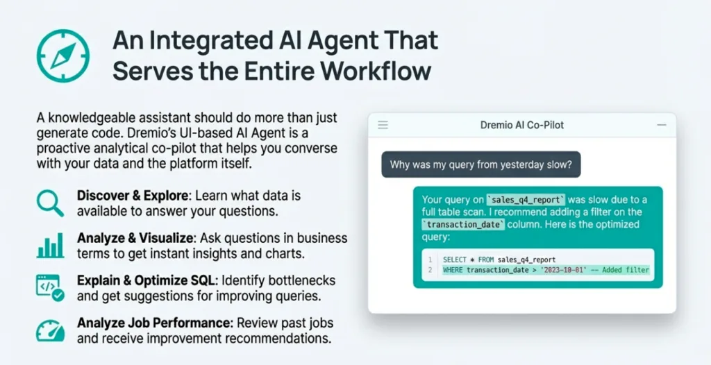 The most valuable AI isn't a standalone feature; it's deeply integrated into the fabric of a platform, solving the tedious, time-consuming, and complex problems that data teams face every day. It's about making the entire data lifecycle smarter, faster, and more efficient. Dremio is a platform that embeds AI in these practical, high-impact ways.