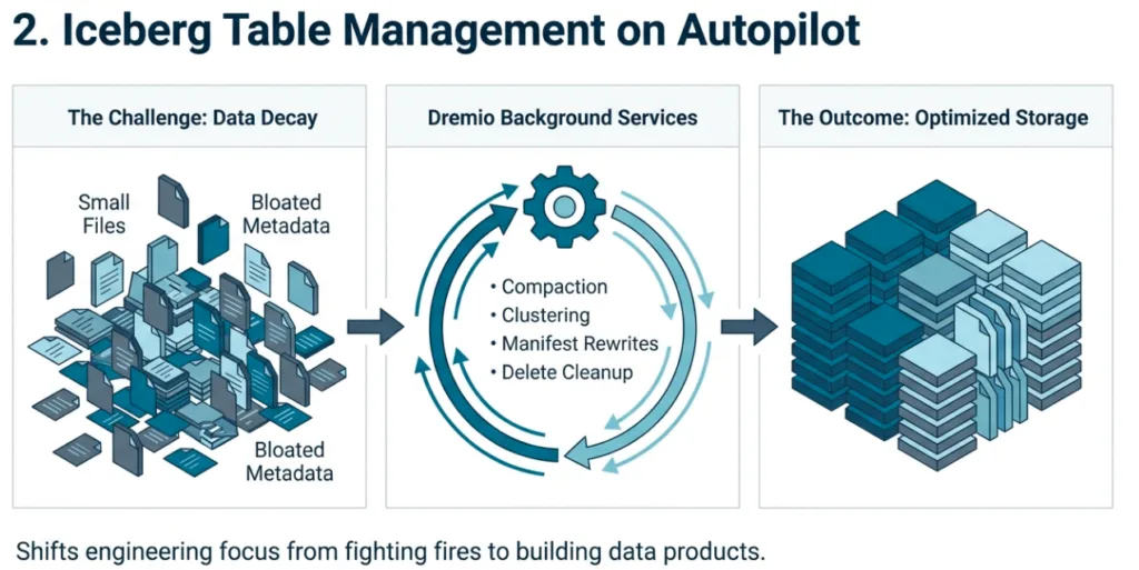 Dremio automates this entire process for Iceberg tables managed by its Open Catalog. The platform runs background maintenance jobs that optimize table structure for speed. This process compacts small files into larger ones, clusters related data, rewrites manifest files for faster metadata reads, and removes obsolete position-delete files.