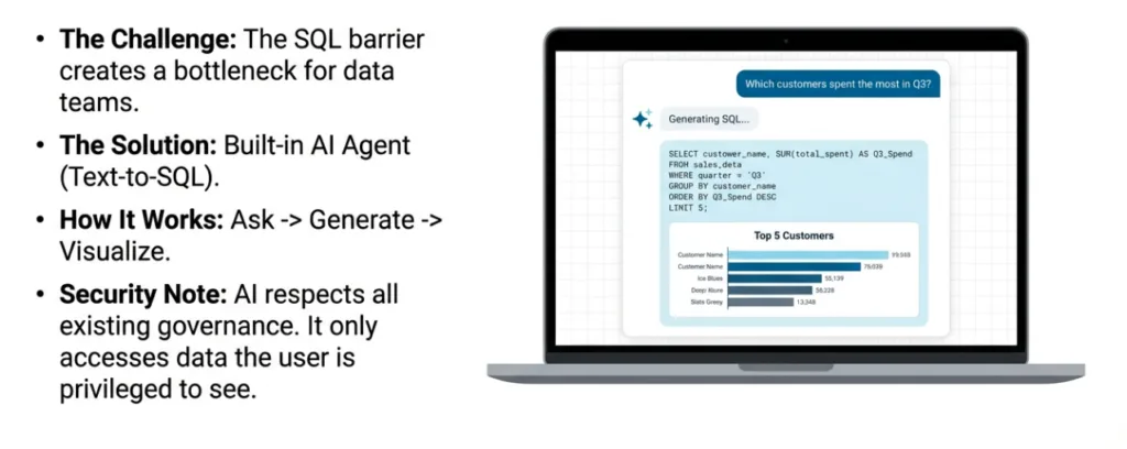 A business user can ask, "Which customers have spent the most with us?" and the AI Agent will generate the necessary SQL, execute it against the data, and return the answer. It can go even further, detecting patterns in the result set and automatically creating visualizations to highlight key insights.