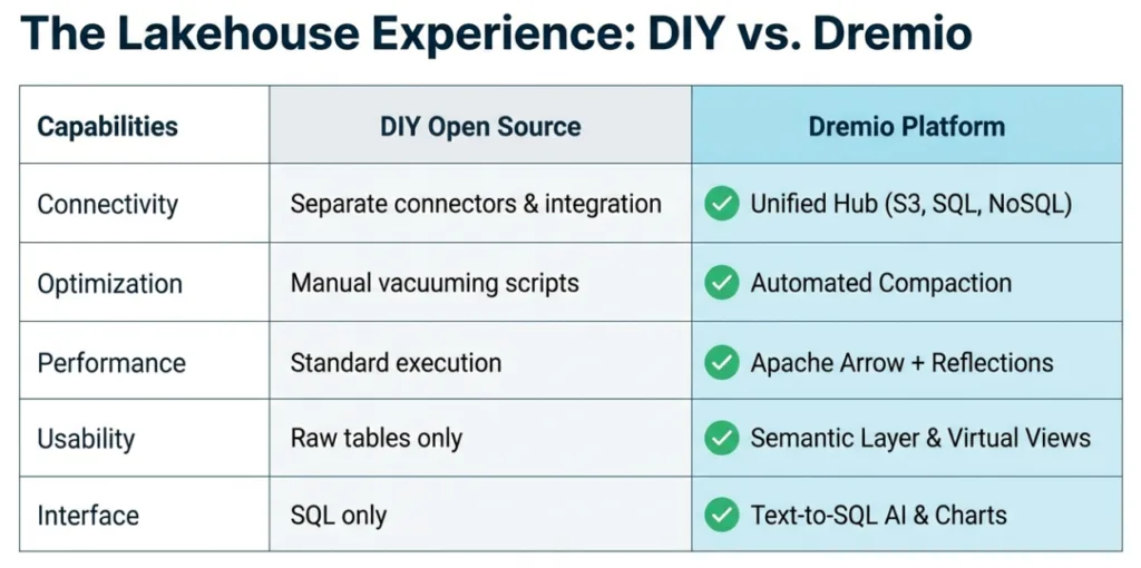 The true value of Dremio isn't just one feature, but its integrated, "all-in-one" platform. This approach contrasts sharply with the DIY method, which often results in a lakehouse that is perpetually a work-in-progress, stitched together with technical debt. Dremio provides a lakehouse that delivers insights from day one. It provides the catalog, the query engine, automated optimization, the semantic layer, and the self-service tools needed for a complete, enterprise-grade solution.