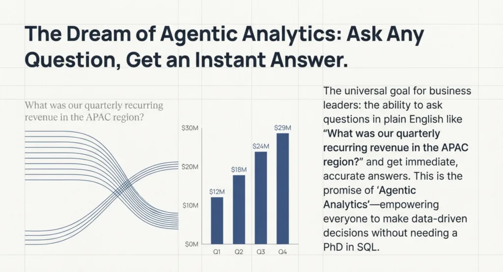 Every business leader shares a common dream: to ask simple questions about their company's data in plain English and get instant, accurate answers. "What was our quarterly recurring revenue in the APAC region?" or "Show me the top 10 most active customers last month." This is the holy grail of business intelligence, the promise of "Agentic Analytics" that companies are pouring their AI budgets into. The idea is simple: empower everyone to make data-driven decisions without needing a PhD in SQL.