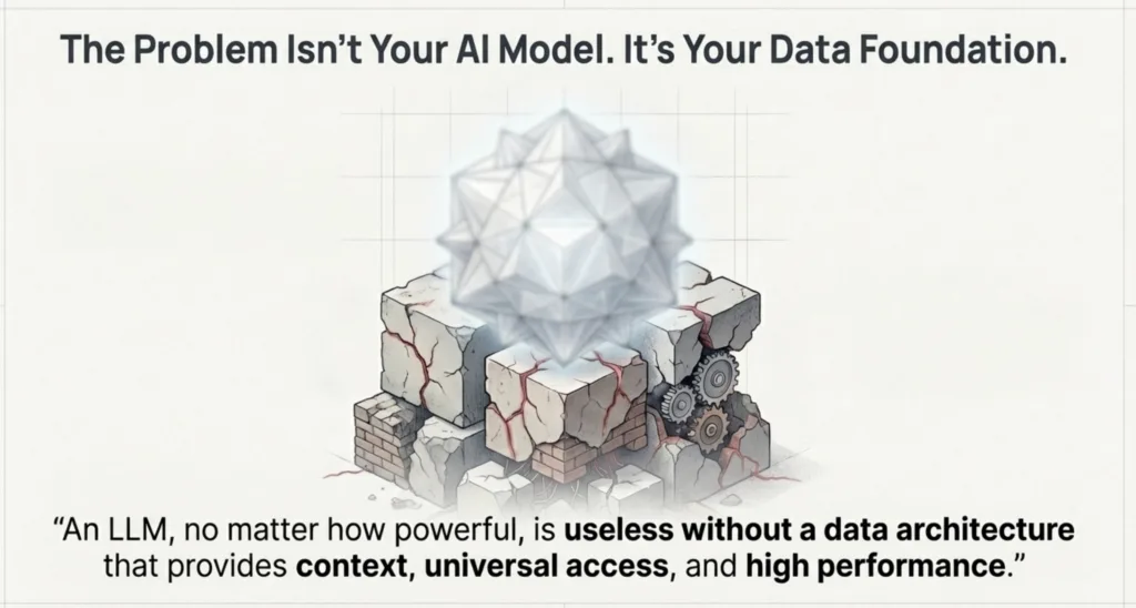The common reaction is to blame the AI model. But the problem isn't the AI; it's the data foundation it's built upon. An LLM, no matter how powerful, is useless without a data architecture that provides context, universal access, and high performance. This article reveals the key components of a data foundation that provides the three missing ingredients: deep business context, universal data access, and interactive speed.