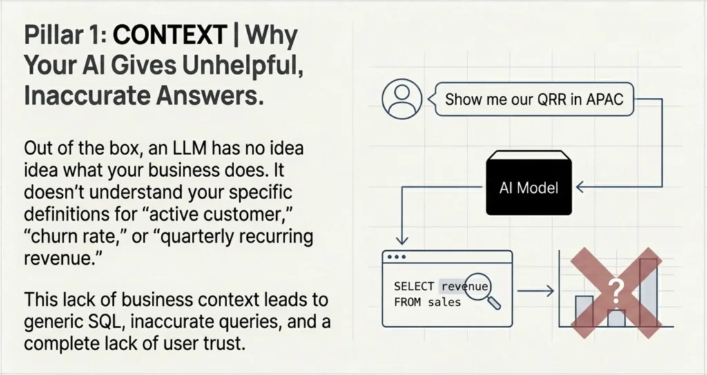 Out of the box, a large language model has no idea what your business does. It doesn't understand your specific definitions for "active customer," "churn rate," or "quarterly recurring revenue." This fundamental lack of business context is why so many AI data assistants fail. They can translate a generic question into generic SQL, but they can't answer a specific business question because they don't speak your company's language. The result is inaccurate queries and a complete lack of trust from users.