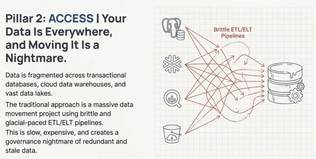 The traditional approach to solving this is a massive data movement project. Teams spend months building brittle and glacial-paced ETL/ELT pipelines to copy all the data into a single, centralized location. This is a slow, expensive process that creates a governance nightmare of redundant and stale data before the AI can even attempt to query it.