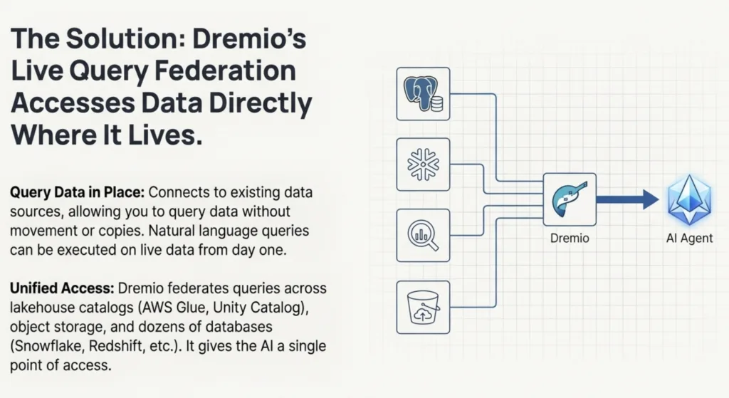 Dremio solves this with live Query Federation, allowing the AI to access data directly where it lives.