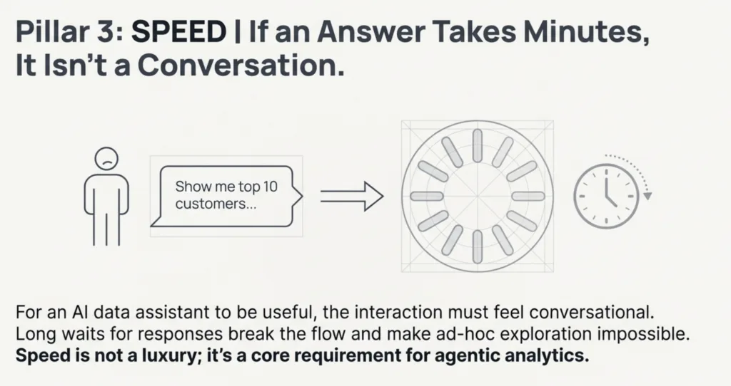 For an AI data assistant to be useful, the interaction must feel like a conversation. If you ask a question and have to wait three minutes for a response, the conversational flow is broken. Users will not adopt a tool that makes ad-hoc exploration and follow-up questions impossible due to slow performance. Speed is not a luxury; it's a core requirement for agentic analytics.