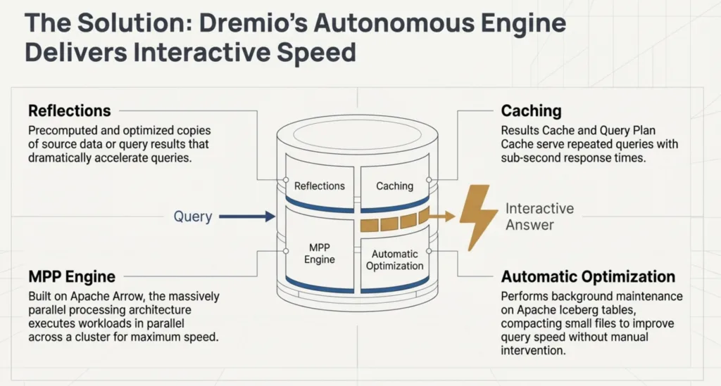 Caching: To avoid redundant work, Dremio utilizes a Results Cache and a Query Plan Cache. If the same query is run multiple times, the results or the optimized execution plan can be served directly from cache, delivering sub-second response times.