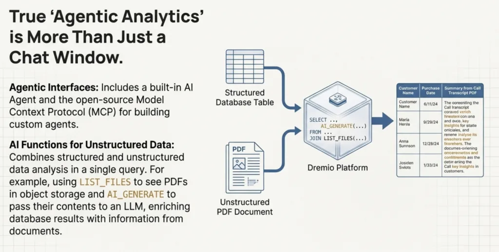- AI Functions for Unstructured Data: Dremio can combine analysis of structured and unstructured data in a single SQL query. Using the LIST_FILES function, you can see files in object storage, and the AI_GENERATE function can pass the contents of those files (like PDFs) to an LLM to extract information. This allows you to ask questions that require pulling structured data from a database and enriching it with information extracted from unstructured documents in your data lake.