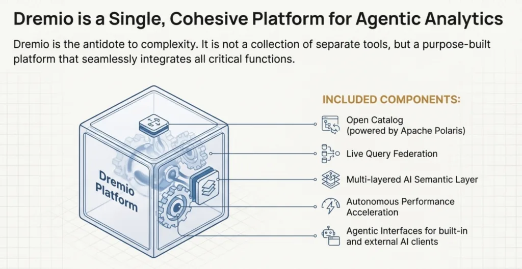 Dremio is designed as a single, cohesive platform that provides all the necessary components for agentic analytics.