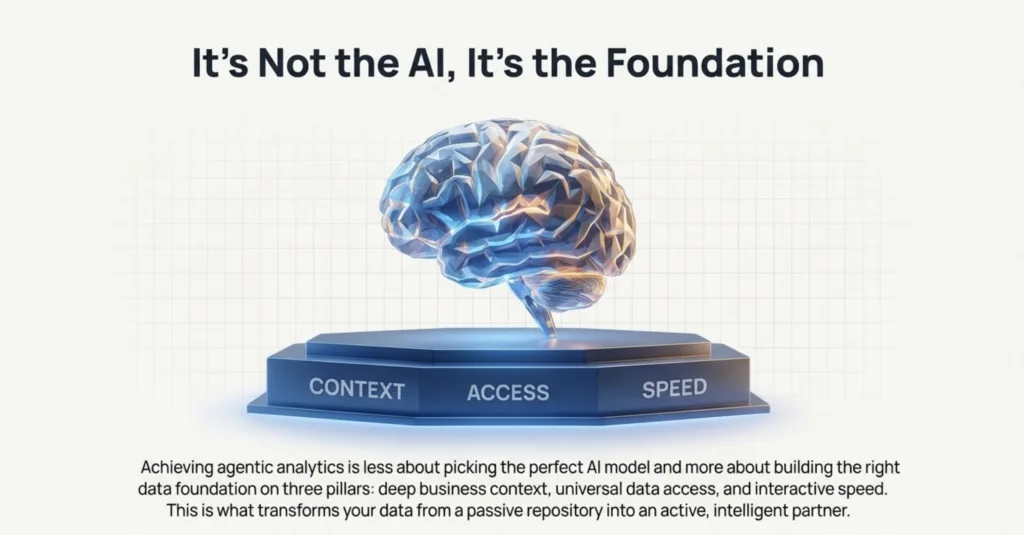 Achieving valuable agentic analytics is less about picking the perfect AI model and more about building the right data foundation. Success depends on three non-negotiable pillars: deep business context from a semantic layer, universal access through live data federation, and interactive speed delivered by autonomous performance features. This is what finally connects the power of AI to the reality of your enterprise data, transforming it from a passive repository into an active, intelligent partner in decision-making.