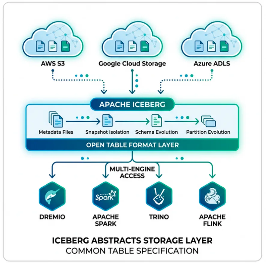 Apache Iceberg was created at Netflix to solve all of these problems. It was donated to the Apache Software Foundation in 2018 and has since become the most widely adopted open table format, supported by more engines than any competitor.