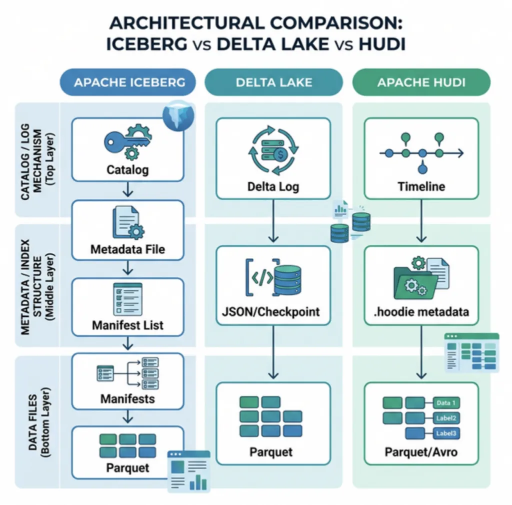 The three major open table formats (Apache Iceberg, Delta Lake, and Apache Hudi) each solve the "open lakehouse" problem differently at the architectural level. While the high-level comparison covers features and ecosystem support, this article dives deeper into the internal architecture of each format, how they organize metadata, handle commits, manage concurrent operations, and implement row-level changes.
