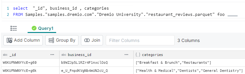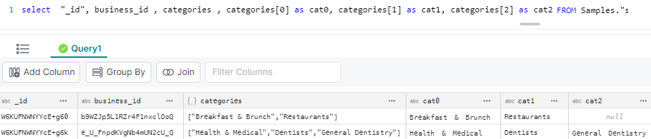 Here, we are retrieving 3 columns. Note that the “categories” column is an array :