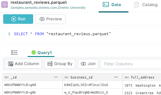 FROM Samples."samples.dremio.com"."Dremio University"."restaurant_reviews.parquet" foo ;