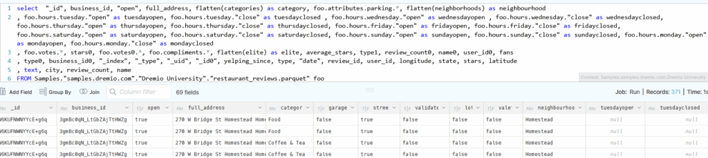 FROM Samples."samples.dremio.com"."Dremio University"."restaurant_reviews.parquet" foo;