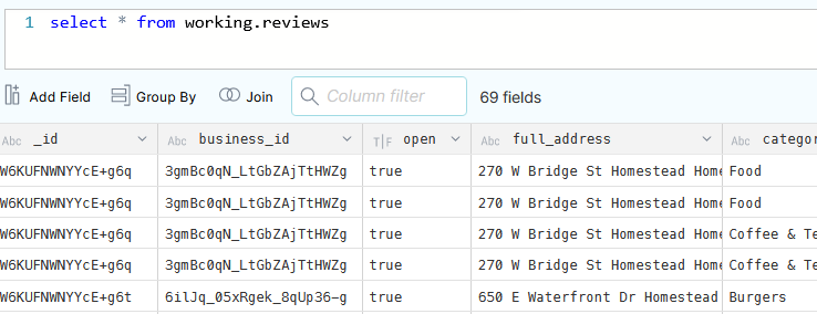 - Also, each entry of that array has been flattened into a column (“category”); each array entry listed on separate rows, e.g. “_id” value ‘W6KUFNWNYYcE+g60’ has 2 entries in the results, one row per category