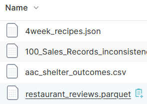 Scroll down the list of files, and click on restaurant_reviews.parquet
