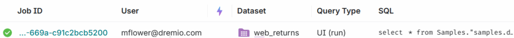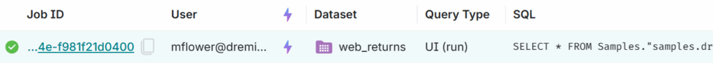 Note that the query has been accelerated with a Reflection; the Job has been flagged with the purple lightning-bolt icon .