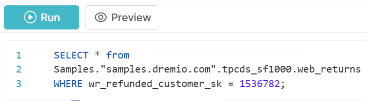 Examine the column wr_refunded_customer_sk. This is the column we would like to filter against. Run this query: