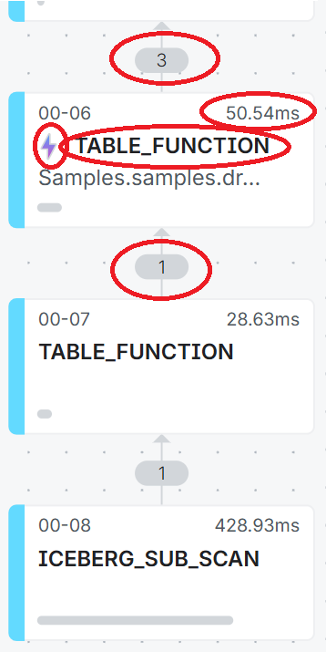 - Later in the plan, we see where the 29 data files were scanned and filtered, in the TABLE_FUNCTION operator.