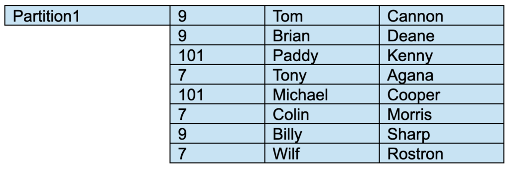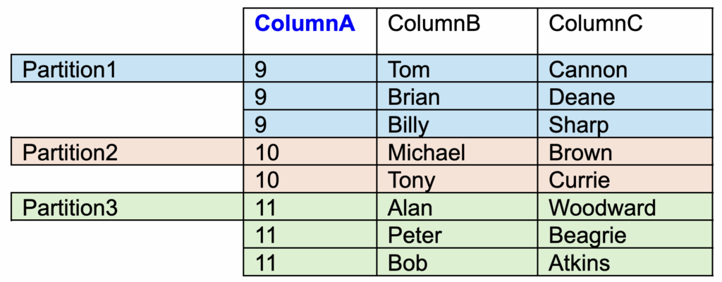 - Partition 1 will contain all rows in which ColumnA = 9.