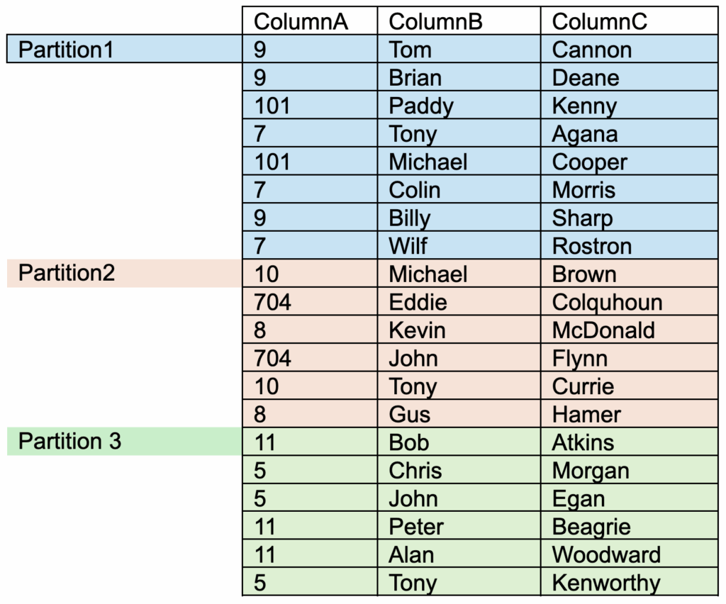 - Partition 1 will not contain rows for any other ColumnA value.