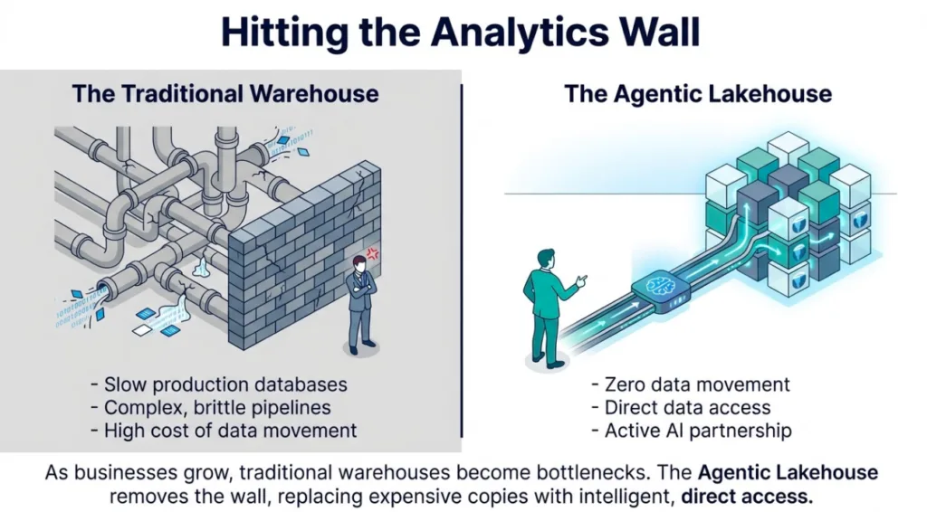Many businesses hit an analytics wall as they grow. Production databases slow down under the weight of complex queries. Marketing teams wait for campaign data while order systems struggle to keep up. The traditional fix is building a data warehouse. This path is often slow and expensive. It requires moving and copying data through brittle pipelines.