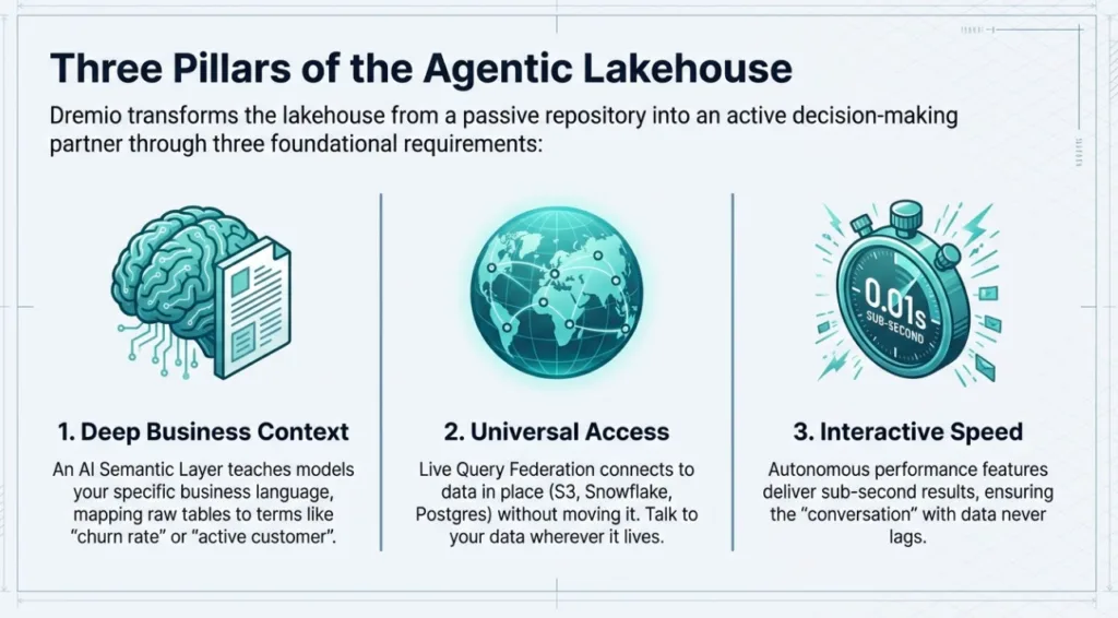 Dremio offers a better alternative called the Agentic Lakehouse. It is the first platform built for AI agents and managed by AI agents. This architecture provides the foundation for agentic analytics. Users can ask questions in plain English and get instant answers.
