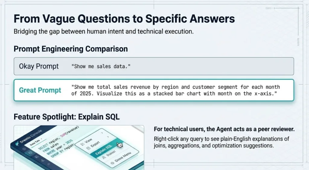 Dremio’s built-in AI Agent is more than a chatbot. It is a proactive analytical co-pilot integrated directly into the Dremio console.