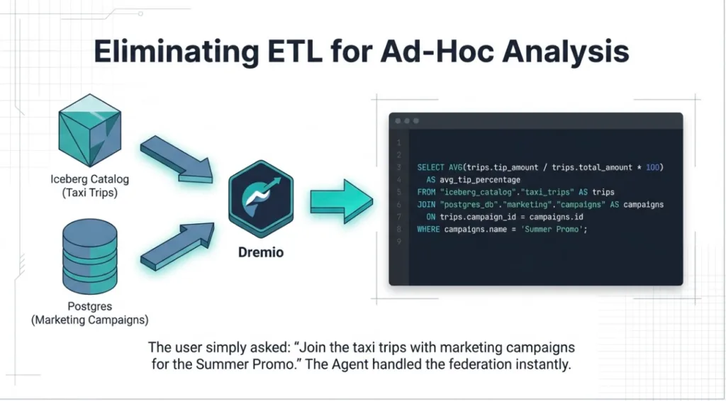 Imagine you need to correlate taxi trip data from your lakehouse with marketing campaign data stored in a relational database. You can simply ask: