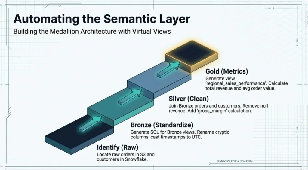 You can use the AI Agent to automate the creation of a medallion architecture (Bronze, Silver, Gold) within Dremio's semantic layer. Unlike traditional systems that require complex pipelines, Dremio allows you to build these layers logically using virtual views.