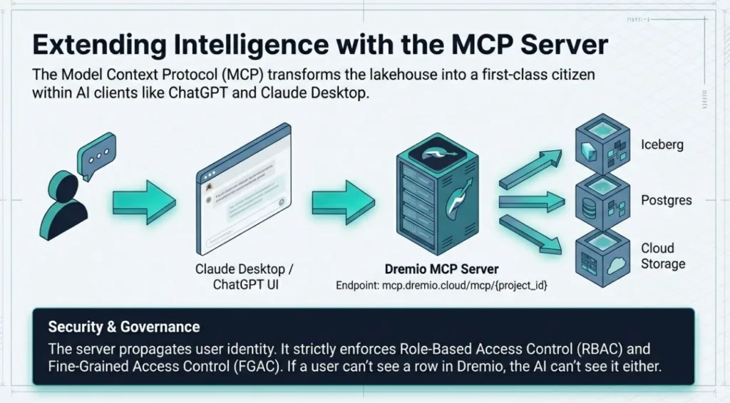 The Dremio MCP server is built for enterprise trust. It does not bypass your security rules. Instead, it propagates user identity. Every query an AI agent runs through the MCP server respects the Role-Based Access Control (RBAC) and Fine-Grained Access Control (FGAC) you have configured in Dremio.