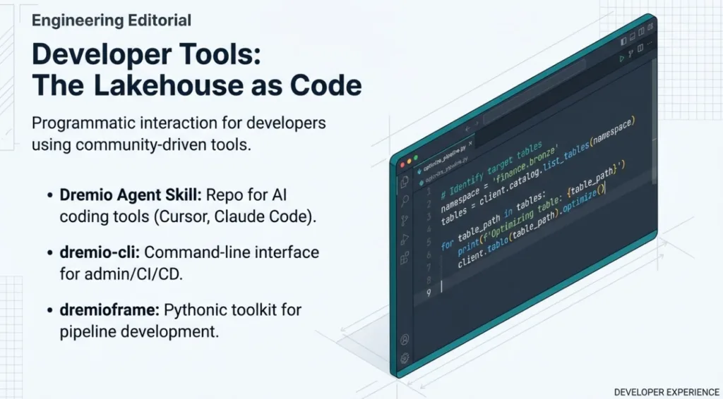 While the native agent and MCP server focus on conversational data analysis, developers often need to interact with the platform programmatically. I have (Dremio’s Head of DevRel, Alex Merced) independently created and maintain a suite of community-driven tools, including the Dremio Agent Skill and several Python libraries. These tools are not officially supported by Dremio, but they provide a robust framework for automating complex data operations.