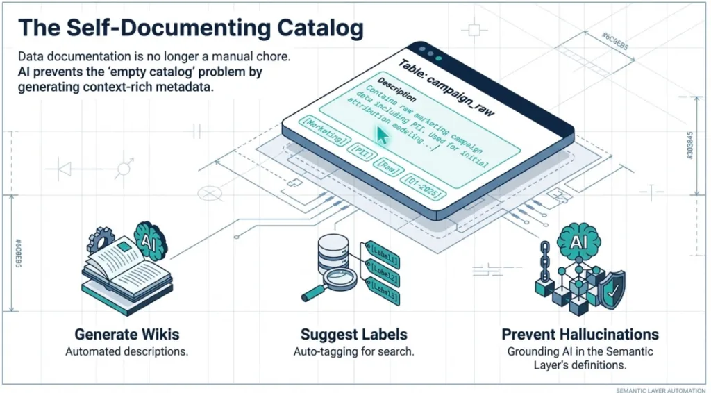 - Generate Wikis: The AI creates context-rich descriptions for tables and views. This helps users understand the purpose of a dataset without hunting down a subject matter expert.