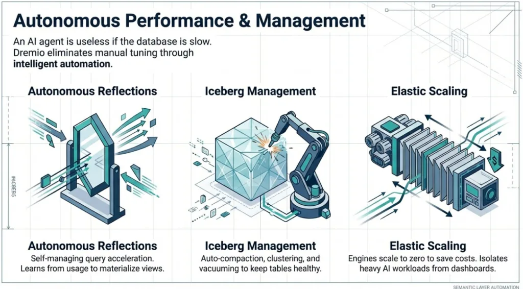 For an agentic analytics experience to be effective, it must be fast. An AI co-pilot loses its value if a user has to wait minutes for a response. Dremio eliminates manual performance tuning through an intelligent engine that autonomously manages resources and acceleration.