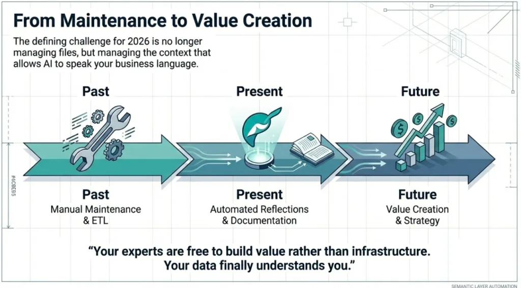The shift is fundamental: data teams are no longer stuck in a cycle of manual maintenance and systems integration. When the platform manages its own reflections, optimizes its own tables, and documents its own metadata, your experts are free to build value rather than infrastructure. The defining challenge for data leaders in 2026 is no longer about managing files; it is about managing the context that allows AI to speak your business language.