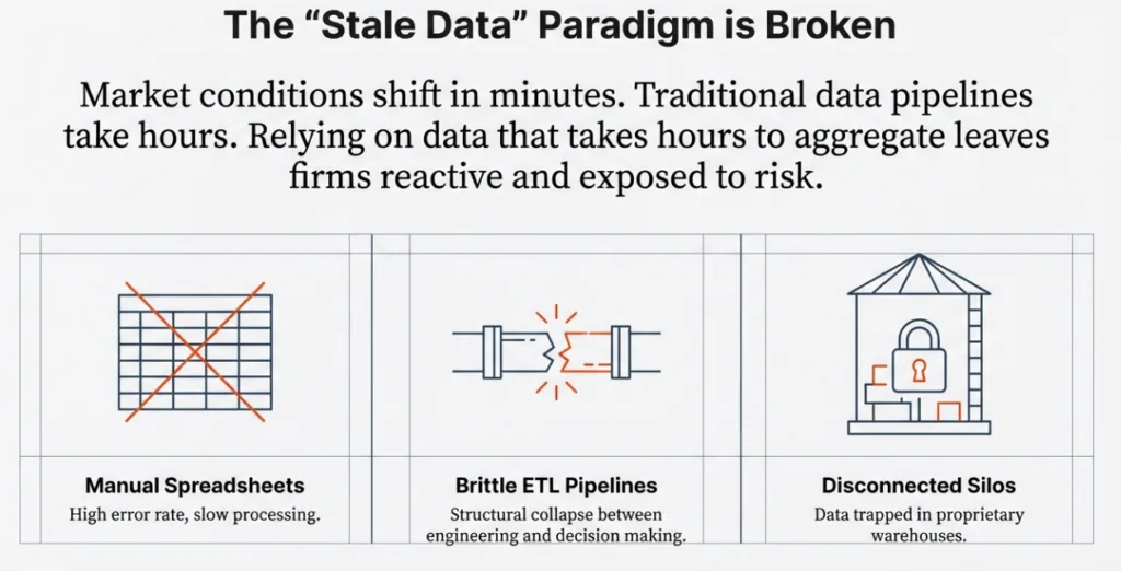 The traditional portfolio rebalancing workflow is broken. We are currently witnessing a structural collapse of the wall between data engineering and real-time decision-making. The "old way", characterized by manual spreadsheets, brittle ETL pipelines, and disconnected data silos, is no longer sustainable. When market conditions shift in minutes, relying on data that takes hours to aggregate leaves firms reactive and exposed to risk.