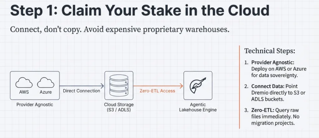 Connect Your Data: Point Dremio to your S3 or Azure Data Lake Storage (ADLS).