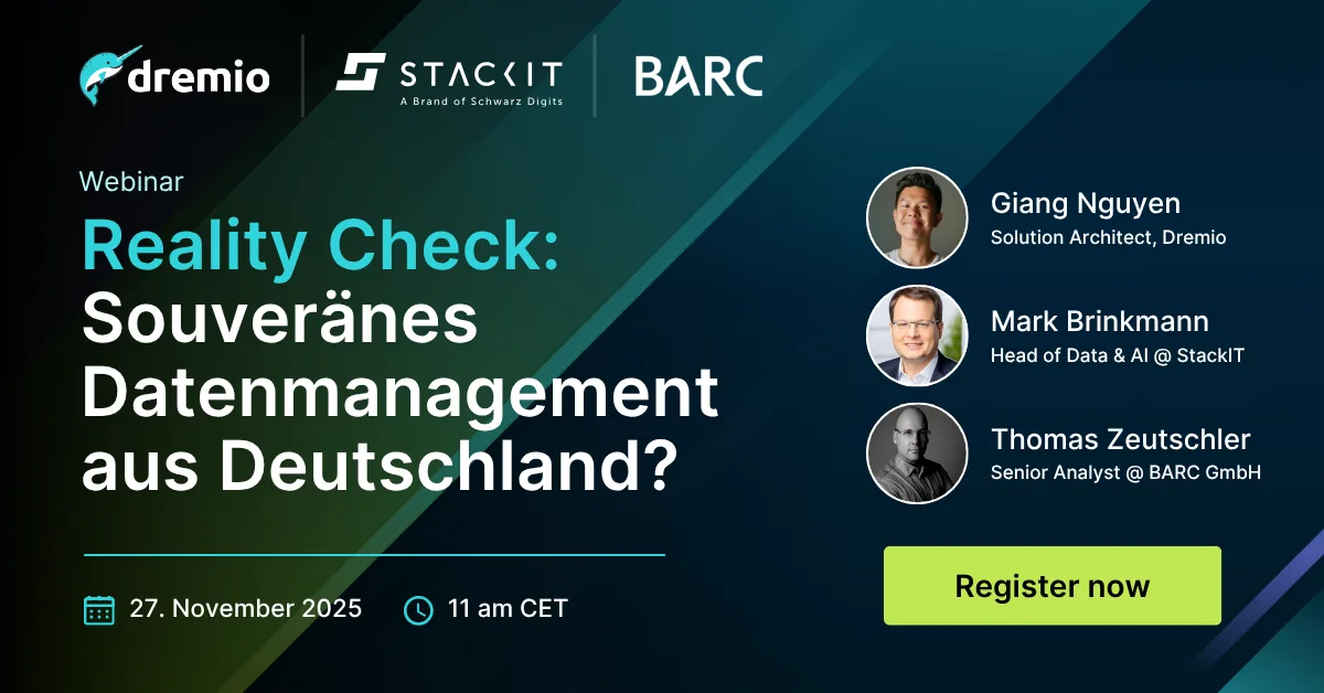 Entdecke, wie Du mit Dremio die Flexibilität von Data Lakes mit der Performance von Data Warehouses verbindest – und so AI- und Analytics-Initiativen deutlich beschleunigst.